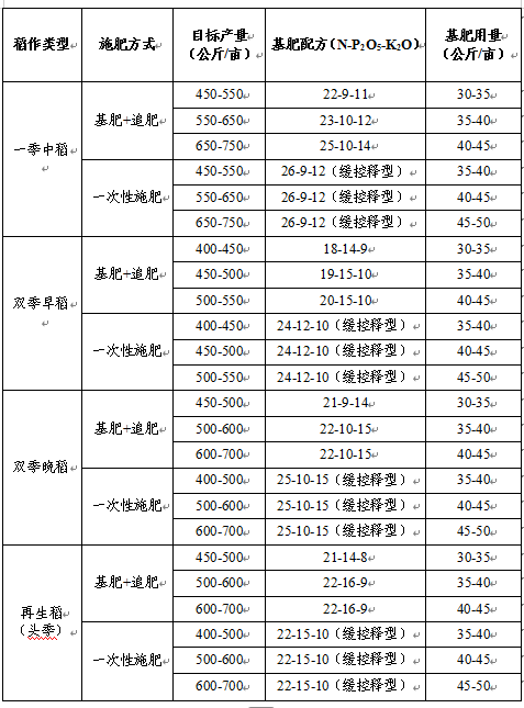 (六)其他。“一次性施肥”模式选用含20%-30%控释期40-45天树脂包膜尿素的配方肥,避免后期脱肥;直播稻田根据苗情适当增加分蘖期追肥比例;避免在烈日正午喷施叶面肥,防止叶片灼伤。