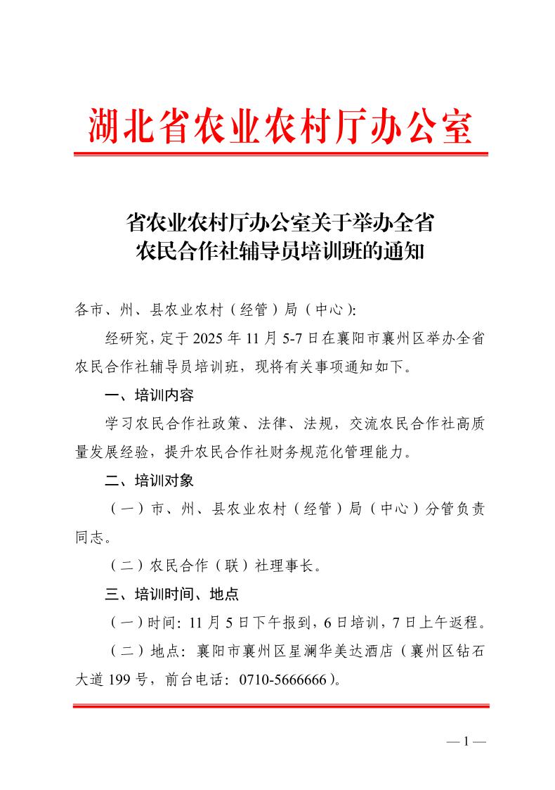 省农业农村厅办公室关于举办全省农民合作社辅导员培训班的通知