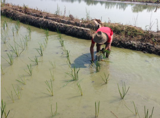 5月中下旬,进行水田育秧。选择排灌两便、有机质丰富、地面平整的水田,每667m2施碳铵和磷肥各50kg,秧田与大田面积比宜为1∶20~1∶25。旱地培育秧苗去除弱苗后,按株距60cm、行距60cm扦插于水田,每15天追肥1次,每次每亩施入有机菌肥20~25kg或尿素5kg,水深保持5cm左右。