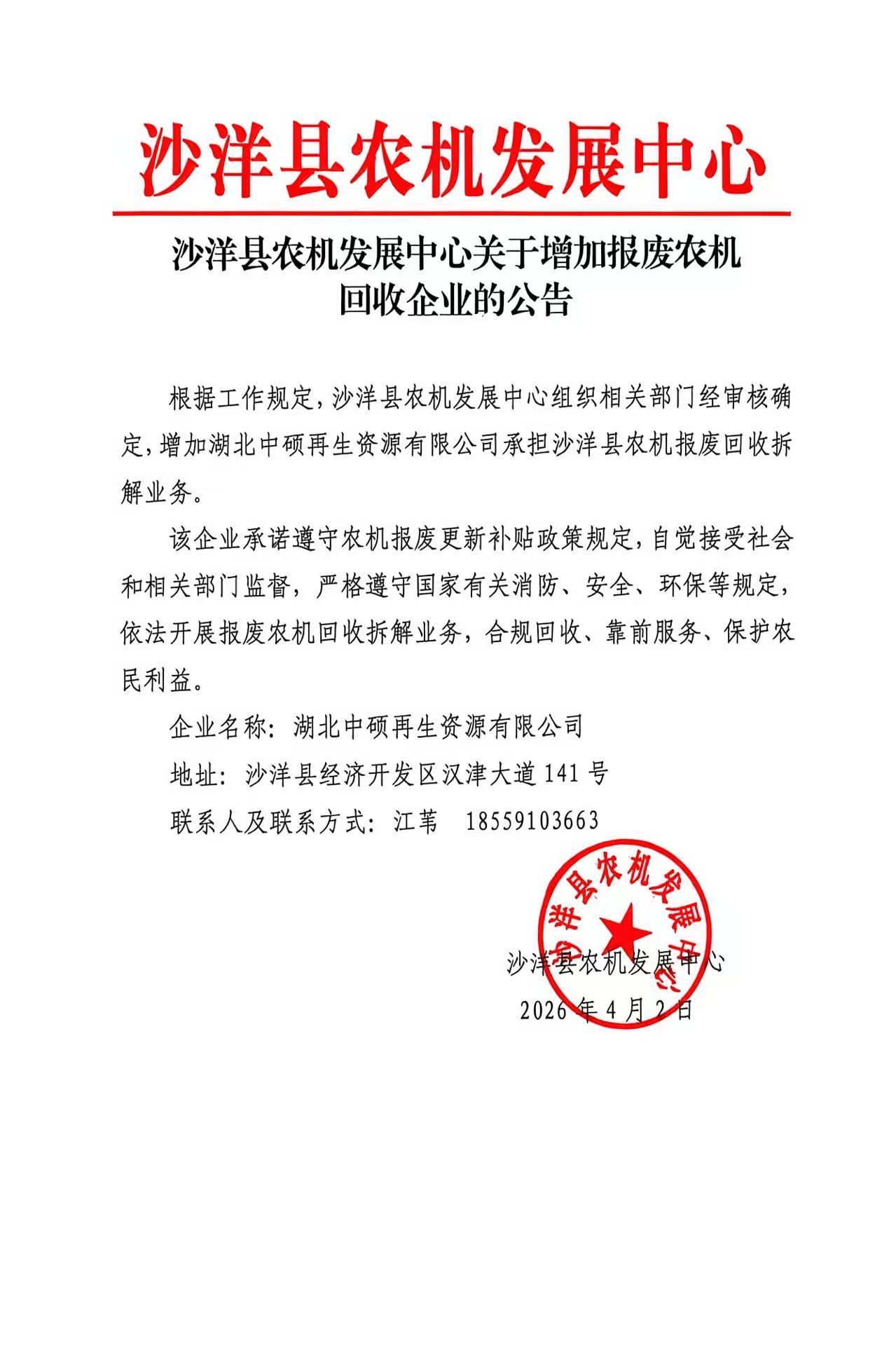 沙洋县农机发展中心关于增加报废农机回收企业的公告