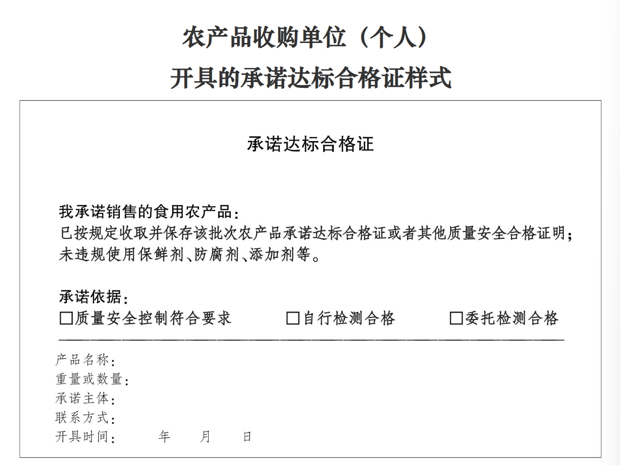 农产品质量安全承诺达标合格证内容及样式正式发布