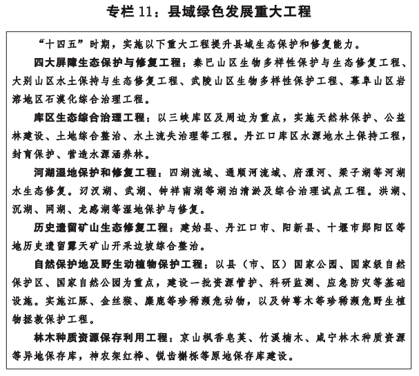 绿色发展成就显著。持续开展生态修复,长江大保护“双十工程”和“四个三”重大生态工程扎实推进,“十三五”期间取缔长江干线各类码头1211个,生态复绿面积856万平方米,新改建乡镇污水处理厂828座,沿江化工企业“关改搬转”405家,搬迁改造危化品企业144家。切实保障南水北调中线工程水源地安全。县域万元GDP能耗五年累计下降17.46%,空气和水体质量明显好转。产业绿色转型取得新进展,16家工厂、11个产品、2个园区纳入国家绿色制造体系示范名单。农村人居环境整治取得新成效,2个县(市)建成“国家森林城市”,丹江口市、保康县尧治河村获评“绿水青山就是金山银山”实践创新基地。
