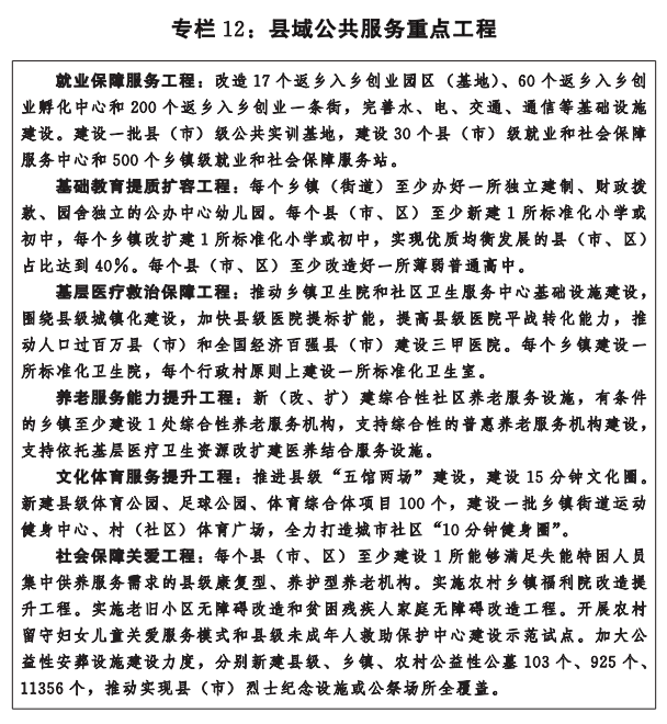 提升农村基本公共服务水平。巩固提升乡村教育办学条件,全面加强乡村小规模学校和乡镇寄宿制学校建设,扩大普惠学前教育资源,每个乡镇至少1所公办中心幼儿园,普惠性幼儿园覆盖率达到80%以上。提升乡村医疗卫生服务能力,加快县域紧密型医疗卫生共同体建设,选建一批中心乡镇卫生院,推进医疗服务达到或接近二级医院水平,标准化建设村级卫生室。加强乡村文化设施建设,因地制宜建设文化礼堂、文化广场、乡村戏台等主题功能空间,实现村级综合性文化服务中心全部达标。加大养老服务设施建设,乡镇区域养老服务中心覆盖率达到60%以上。提升特困人员供养服务,建立农村留守儿童“希望家园”1000个,农村生活不能自理特困人员集中供养率达到60%以上。提高村级综合服务能力,推进供电、供水、供热、供气、社保等公共服务事项进驻村级综合服务站,为农民提供“一站式”办理服务。