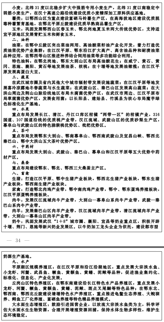 打造全国特色农产品生产优势区。在统筹保粮供油的基础上,突破性发展鳜鱼、乌鳢、黄颡鱼、鳝鳅、河蟹等名特品种,保持湖北特色淡水渔业在全国的领先地位,“潜江龙虾”成为全国小龙虾第一品牌。提升湖北“绿红黑白高香茶”内在品质,实施鄂茶效能倍增计划,力争湖北茶产业综合产值进入全国前三位。布局“三江三库”,打造以蜜桔、脐橙为主的知名“橘谷”,保持全国前三名。传承药圣之乡、神农故里等历史文化,挖掘蕲艾、茯苓等中药材发展潜力,建成“中国华中药库”。(三江三库:长江、汉江、清江和三峡水库、丹江口水库、富水水库。)