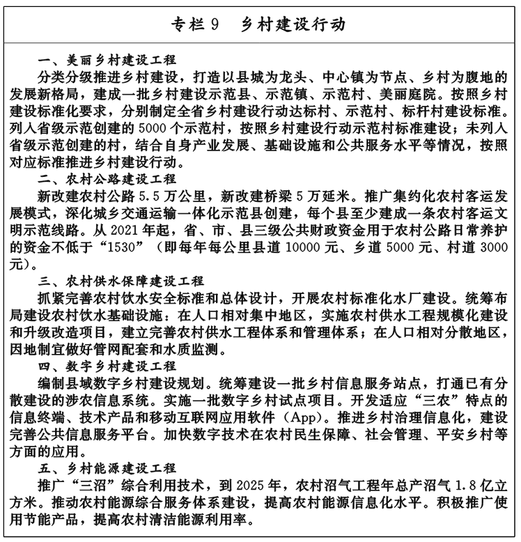 美丽乡村建设取得重大进展。开展农村人居环境整治“五年提升行动”,农村自来水普及率达到95%、集中式饮用水源水质达标率达到100%、卫生厕所普及率达到95%、生活污水治理率超过40%。新建双车道及以上标准农村公路4万公里、所有行政村全部通动力电、5G网络基本实现乡镇镇区全覆盖、行政村5G通达率达到80%。到“十四五”末,在原有2000个美丽乡村示范村基础上,再建5000个乡村建设行动示范村,美丽乡村建设达到浙江“千万工程”现有水平。