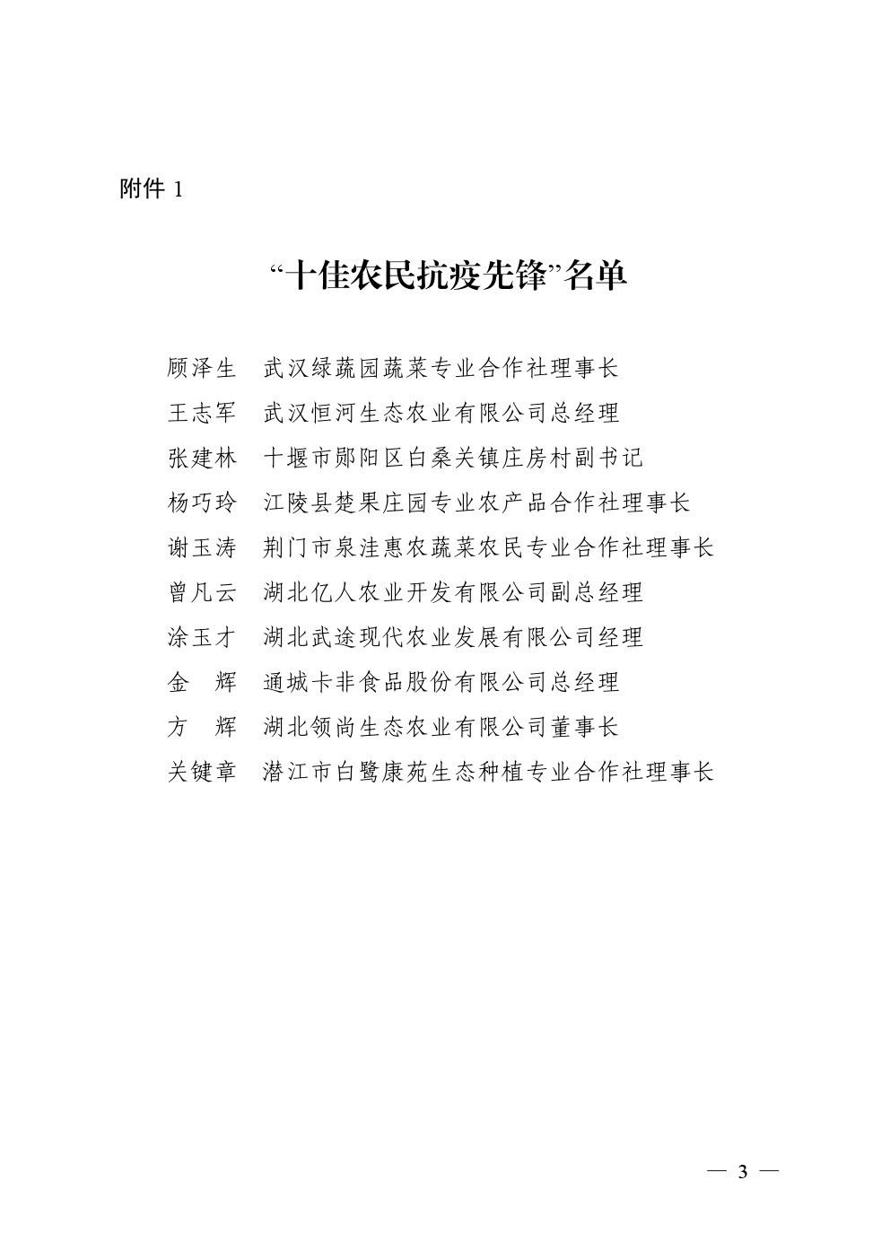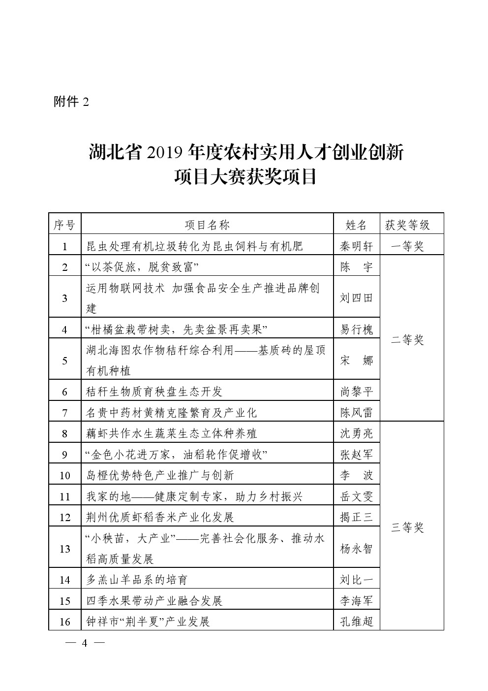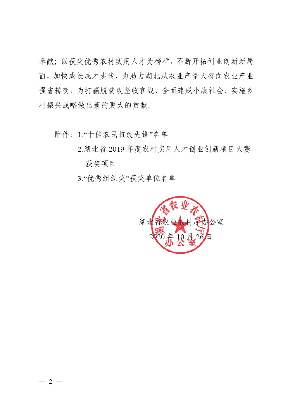 省农业农村厅办公室关于公布 湖北省 2019 年度农村实用人才创业创新 项目大赛及“十佳农民抗疫先锋” 评选结果的通知