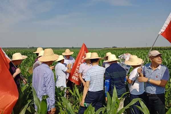 7月2日下午,松滋市涴市镇釆穴垸村13组一玉米地里,印有“松滋市农业技术推广中心”字样的旗帜及中国共产党党旗迎风飘扬分外耀眼,翠绿的玉米行间人头攒动。
